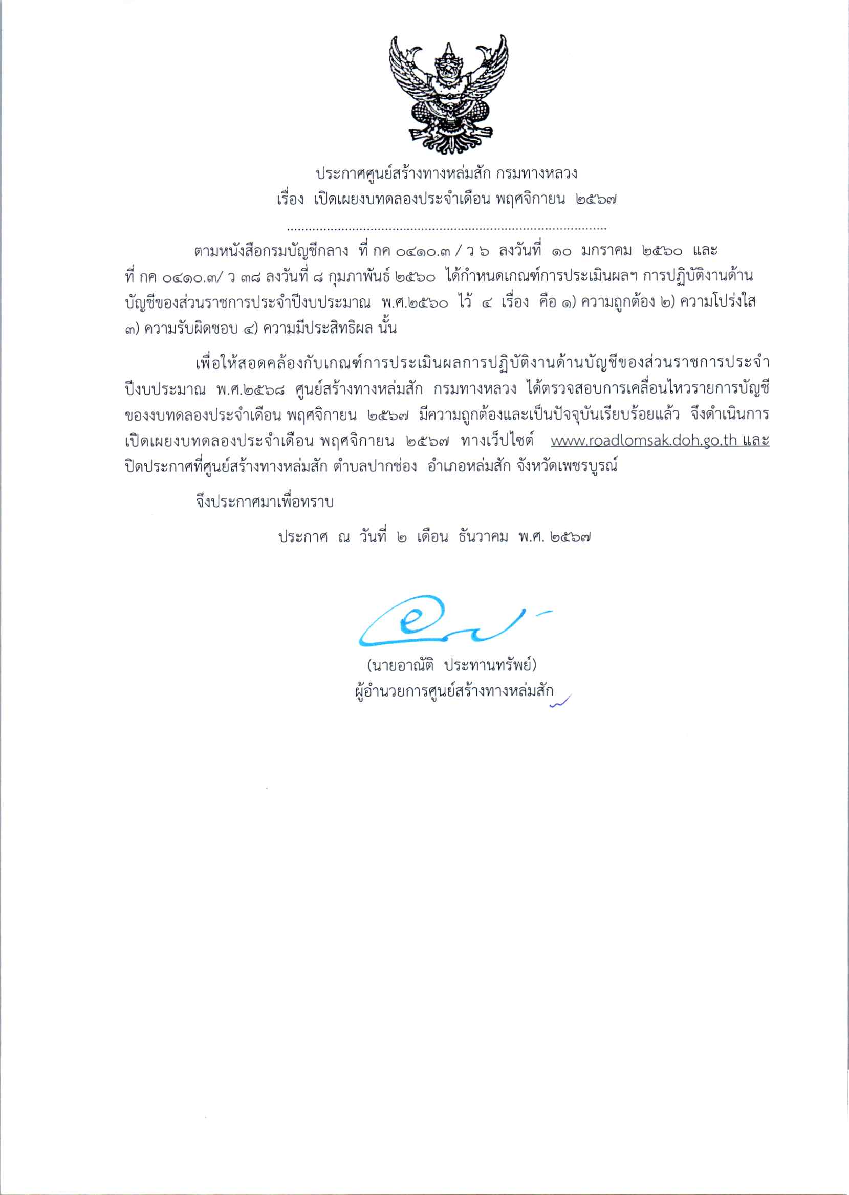 ประกาศเปิดเผยงบทดลองประจำเดือน พฤศจิกายน 2567 ปีงบประมาณ 2568