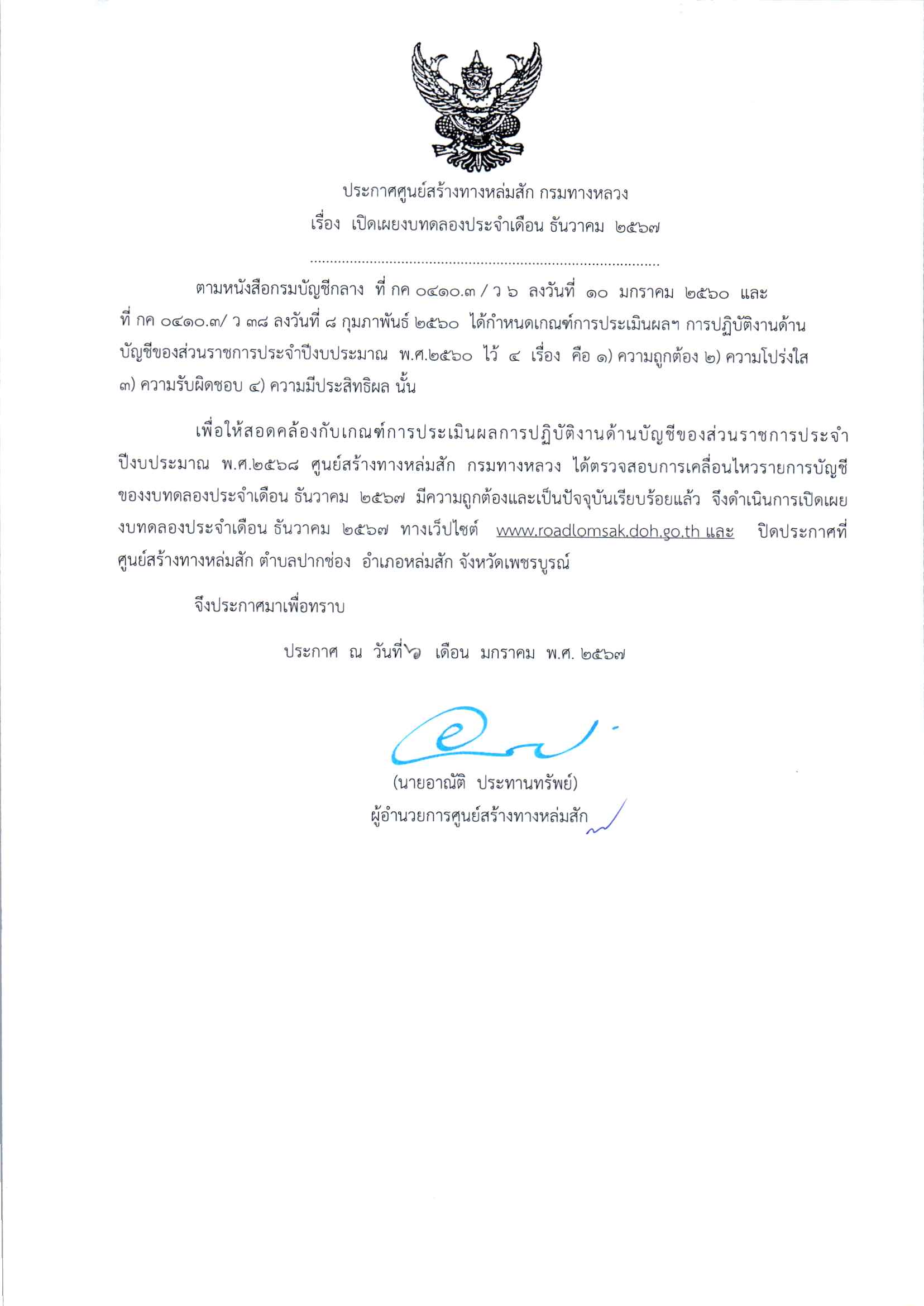 ประกาศเปิดเผยงบทดลองประจำเดือน มกราคม 2569 ปีงบประมาณ 2569