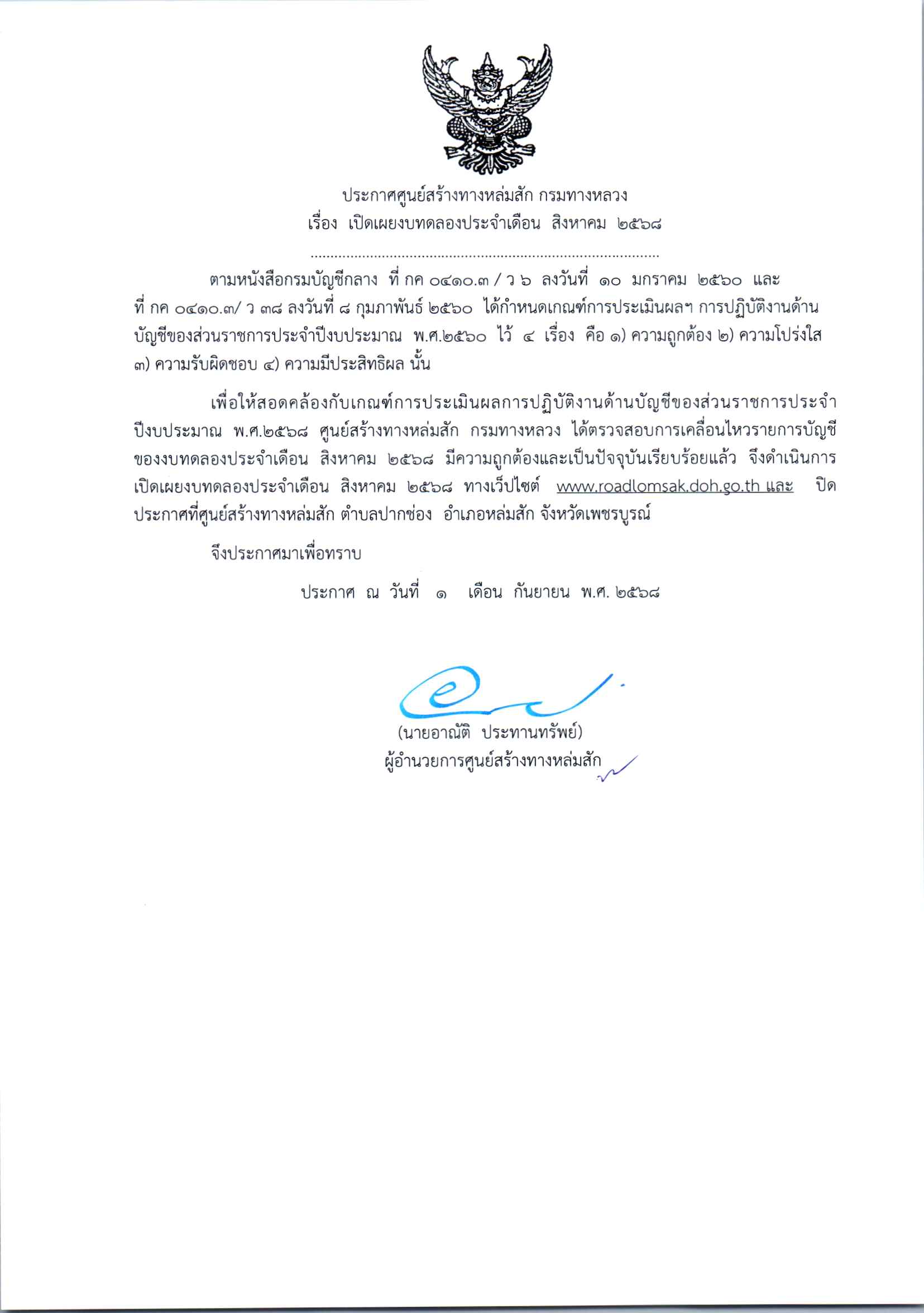 ประกาศเปิดเผยงบทดลองประจำเดือน กันยายน 2568 ปีงบประมาณ 2568