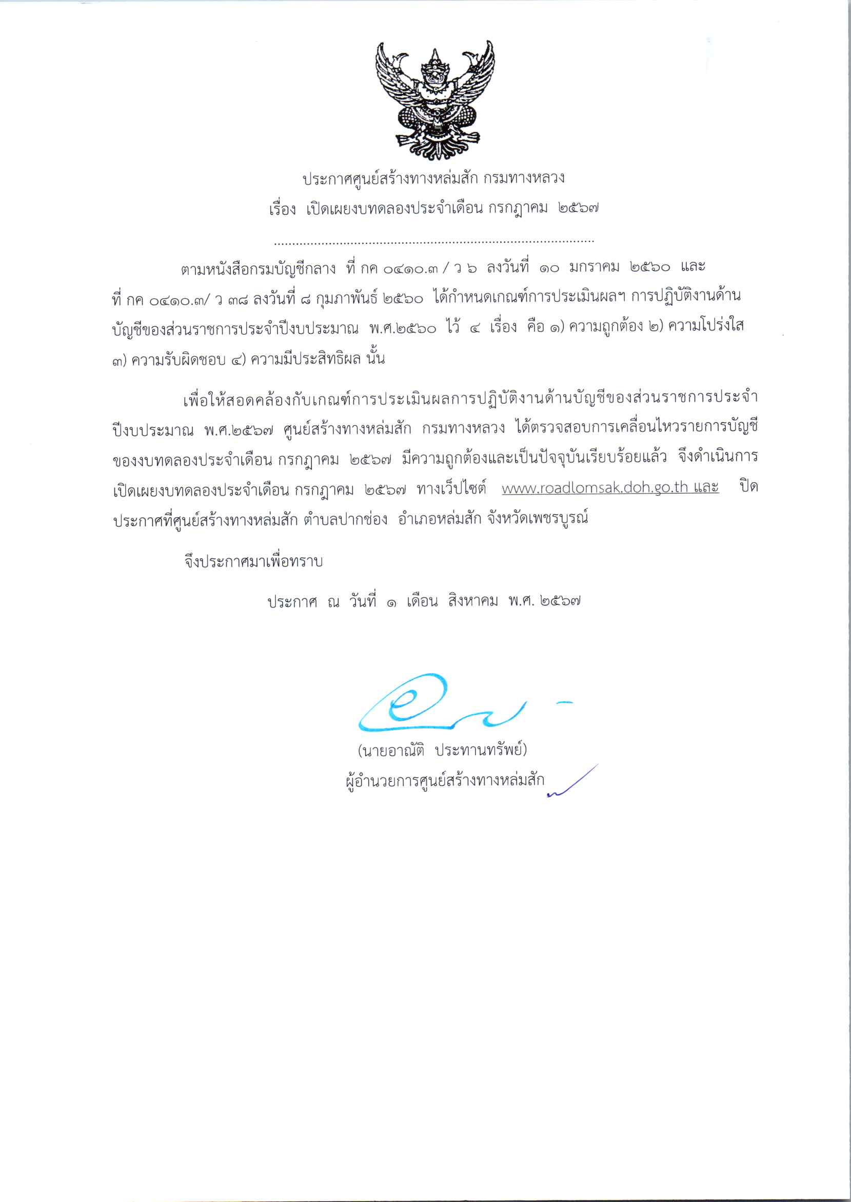 ประกาศเปิดเผยงบทดลองประจำเดือน กรกฎาคม 2567 ปีงบประมาณ 2567 ตามหนังสือกรมบัญชีกลาง ที่ กค 0410.3/ว 6 ลงวันที่ 10 มกราคม 2560 และ ที่ กค 0410.3/ ว 38 ลงวันที่ 8 กุมภาพันธ์ 2560 ได้กำหนดเกณฑ์การประเมินผลฯ การปฏิบัติงานด้านบัญชีของส่วนราชการประจำปีงบประมาณ พ.ศ.2560 ไว 4 เรื่อง 1.ความถูกต้อง 2.ความโปร่งใส 3.ความรับผิดชอบ 4.ความมีประสิทธิผล