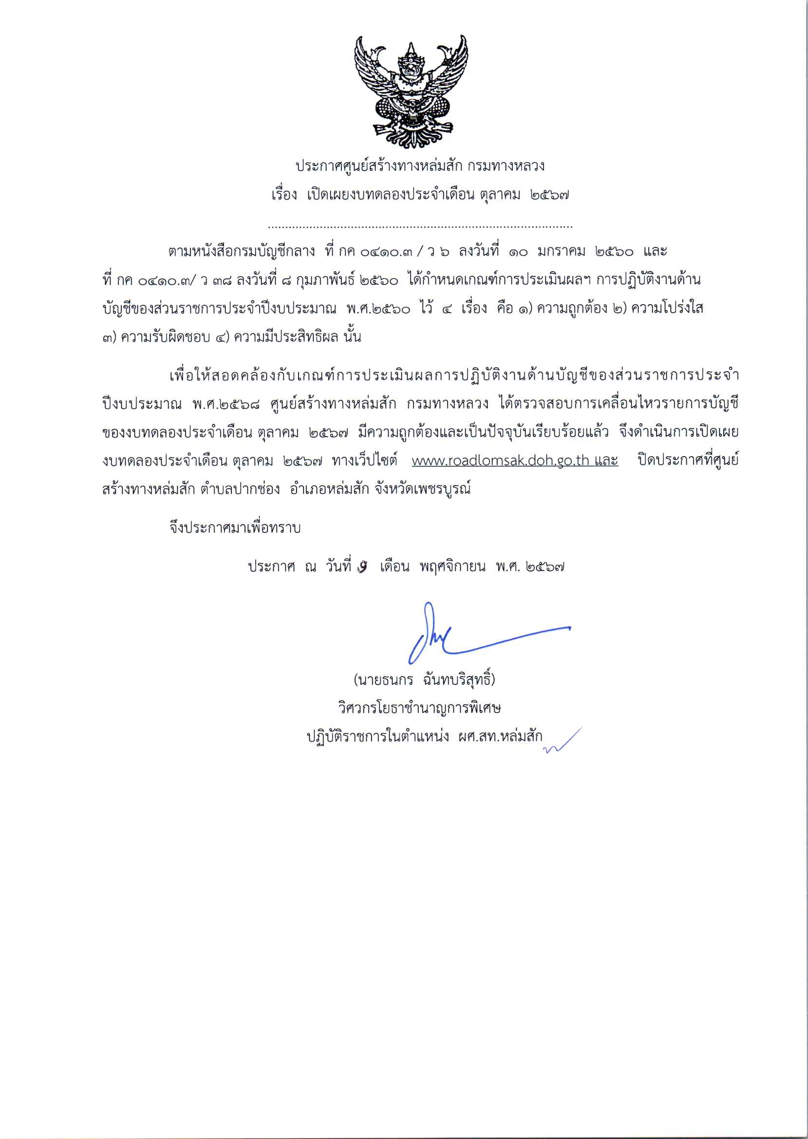 ประกาศเปิดเผยงบทดลองประจำเดือน ตุลาคม 2567 ปีงบประมาณ 2568 ตามหนังสือกรมบัญชีกลาง ที่ กค 0410.3/ว 6 ลงวันที่ 10 มกราคม 2560 และ ที่ กค 0410.3/ ว 38 ลงวันที่ 8 กุมภาพันธ์ 2560 ได้กำหนดเกณฑ์การประเมินผลฯ การปฏิบัติงานด้านบัญชีของส่วนราชการประจำปีงบประมาณ พ.ศ.2560 ไว 4 เรื่อง 1.ความถูกต้อง 2.ความโปร่งใส 3.ความรับผิดชอบ 4.ความมีประสิทธิผล