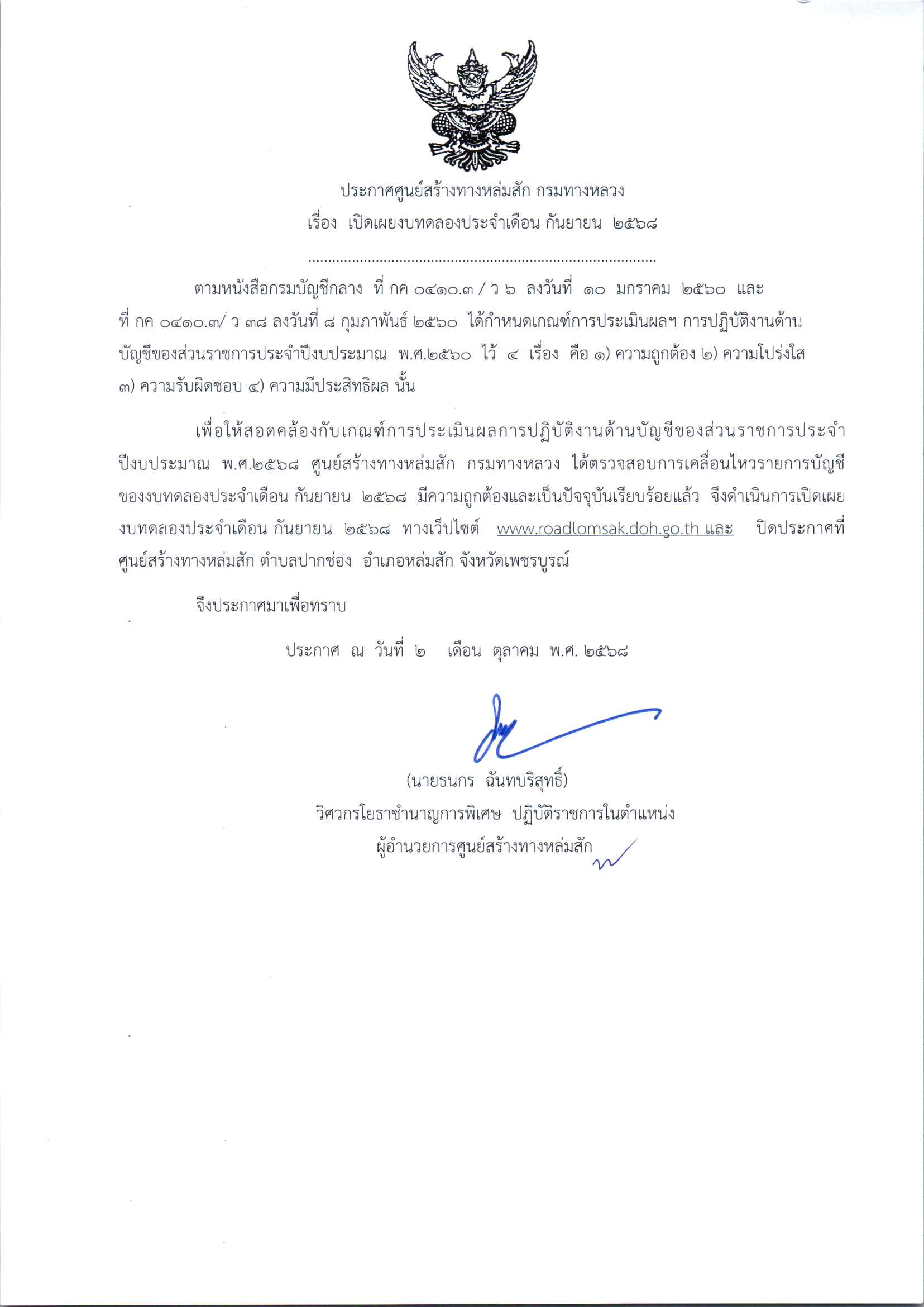 ประกาศเปิดเผยงบทดลองประจำเดือน กันยายน 2568 ปีงบประมาณ 2568 ตามหนังสือกรมบัญชีกลาง ที่ กค 0410.3/ว 2 ลงวันที่ 10 กรกฏาคม 2560 และ ที่ กค 0410.3/ ว 38 ลงวันที่ 8 กุมภาพันธ์ 2560 ได้กำหนดเกณฑ์การประเมินผลฯ การปฏิบัติงานด้านบัญชีของส่วนราชการประจำปีงบประมาณ พ.ศ.2560 ไว 4 เรื่อง 1.ความถูกต้อง 2.ความโปร่งใส 3.ความรับผิดชอบ 4.ความมีประสิทธิผล